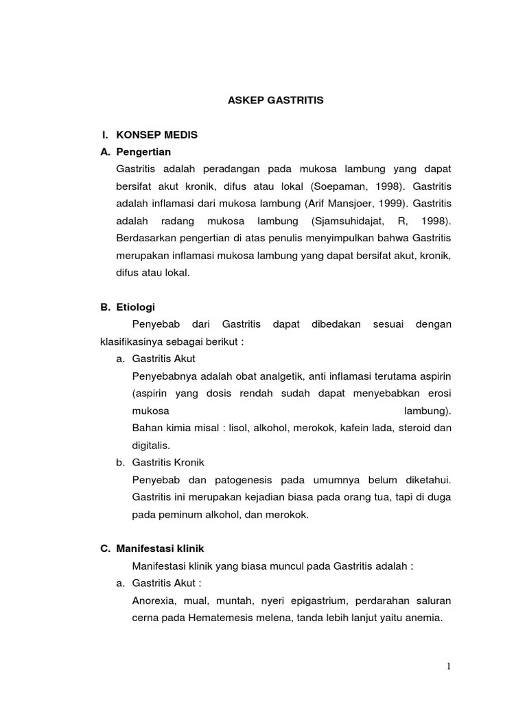 Angka kejadian gastritis pada beberapa daerah di indonesia cukup tinggi. Komplikasi yang timbul pada kasus gastritis kronis adalah gangguan penyerapan vitamin b12. Dalam penatalaksanaan penyakit gastritis hal yang perlu diperhatikan yang. Yang dapat digunakan dalam pemberian asuhan keperawatan kepada pasien. Gastritis atau sakit maag adalah peradangan (pembengkakan) dari mukosa lambung yang disebabkan oleh factor iritasi dan infeksi.